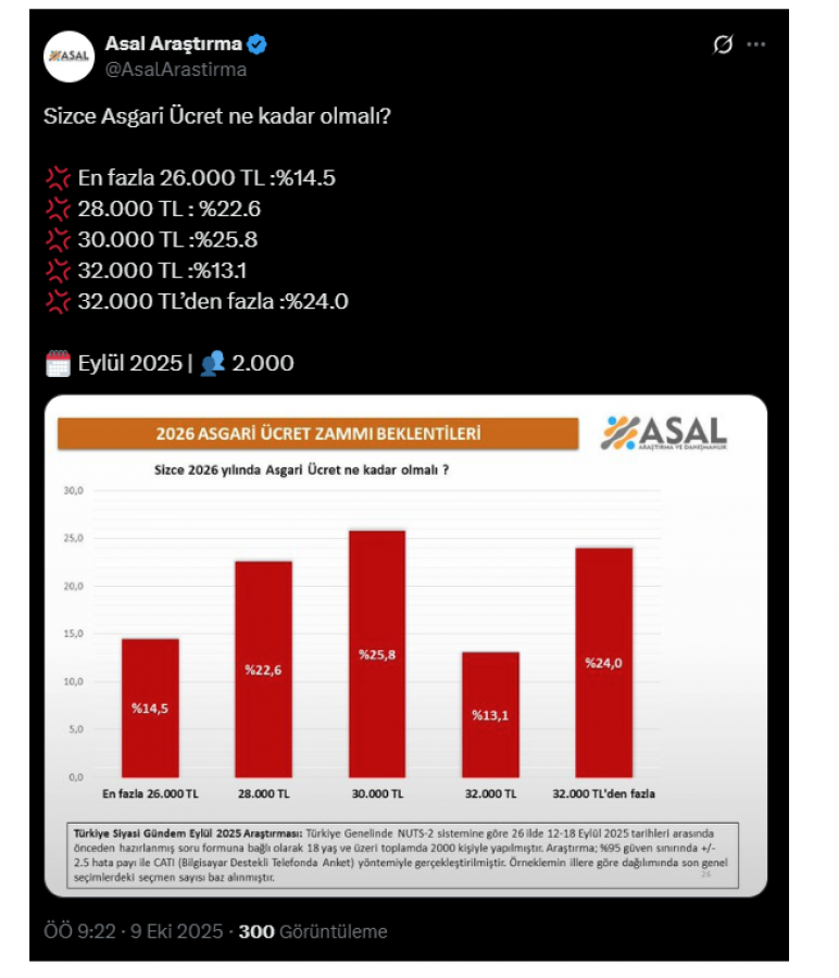 Asal Araştırma tarafından 12-18 Eylül tarihleri arasında 26 ilde yapılan ankette 2 bin katılımcıya, “Sizce 2026 yılında asgari ücret ne kadar olmalı?” sorusu yöneltildi.