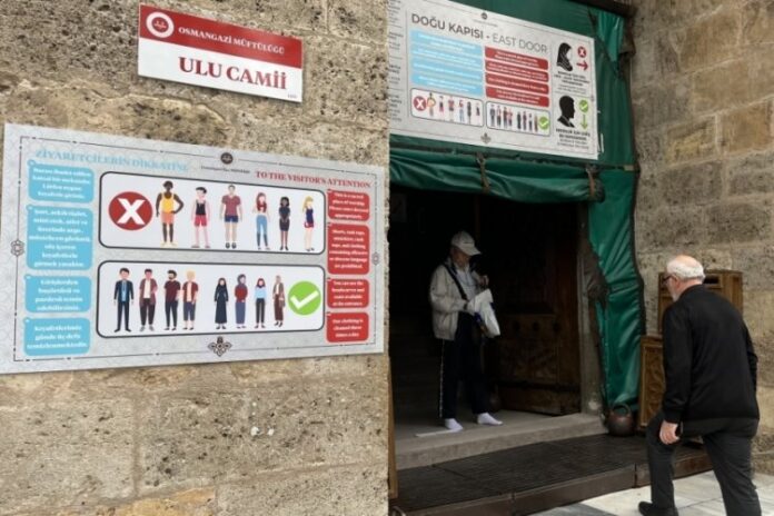 Bursa’da tarihi camilere gelen yerli ve yabancı turistlerin uygunsuz kıyafetleri artık tarihe karışıyor. Türkiye genelinde tepki çeken görüntülerin ardından Bursa İl Müftülüğü, tarihi camilerde kıyafet adabına yönelik yeni bir düzenleme getirdi. Camiye uygun kıyafetle gelmeyen ziyaretçilere mavi yelekli Diyanet Vakfı görevlileri tarafından uygun giysiler temin edilecek. Gelen turistler ziyaret adabına uygun kıyafeti giyip camiye o şekilde girebilecek.