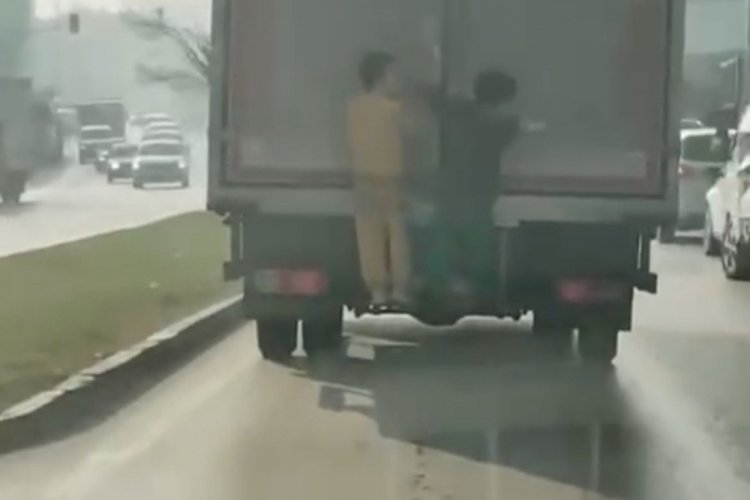 Bursa’da iki çocuğun seyir halindeki kamyonun arkasına tutunarak dakikalarca yolculuk yapmaları yürekleri ağza getirdi. O anlar ise amatör bir kameraya anbean yansıdı.