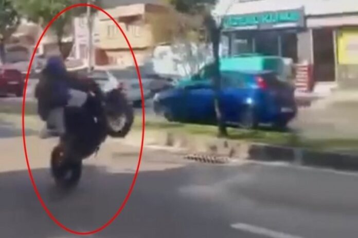 Bursa’da, motosikletle tek tekerlek üzerinde ilerleyen sürücü kaza yaptı. Sürücünün motosikletten düşüp sürüklendiği anlar, cep telefonuyla görüntülendi.