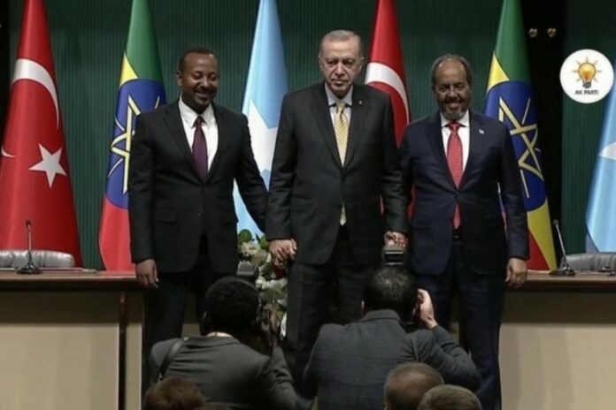 Cumhurbaşkanı Erdoğan, Somali Cumhurbaşkanı Hasan Şeyh Mahmud ve Etiyopya Başbakanı Abiy Ahmed ile Cumhurbaşkanlığı Külliyesi’nde bir araya geldi. Erdoğan görüşmelerin ardından yaptığı açıklamada, “Kırgınlıkları ve yanlış anlamaları aşmak suretiyle, Somali ve Etiyopya arasında barış ve işbirliğine dayalı yeni bir başlangıcın ilk adımını atmış olduk. Büyük özverilerle bu tarihi uzlaşıya vardıkları için değerli kardeşlerimi tebrik ediyorum” ifadelerini kullandı.