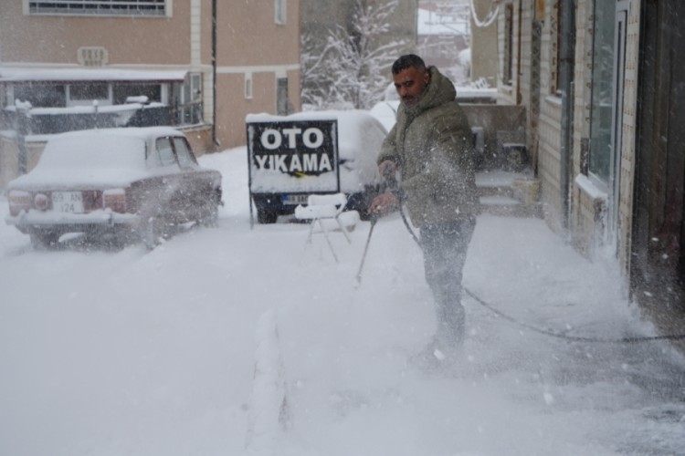 Bayburt’ta gece saatlerinde etkili olan kar yağışıyla kent merkezi yeniden beyaza bürünürken, bir oto yıkamacının kar temizlemek için kullandığı yöntem dikkat çekti. Dükkanının önündeki karı kürekle temizlemekten yorulan esnaf, çareyi oto yıkama makinesinde buldu. Araç yıkamada kullanılan yüksek basınçlı yıkama makinesiyle dükkanının önünde biriken karları temizleyen esnaf daha sonra buzlanma riskine karşı tuzlama yaptı.