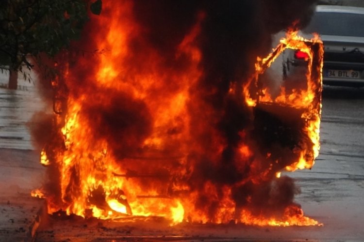 Kartal’da bir yolcu minibüsü alev alev yandı. Minibüste bulunan 20 kişi yangından önce tahliye edilirken, yanan minibüs ise küle döndü.