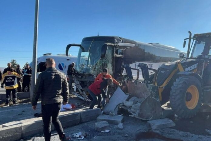 Endonezyalı turistleri taşıyan otobüsün yol çalışması yapan iş makinesine çarptığı feci kazada iş makinesi operatörü ile birlikte 6 kişi yaralandı.
