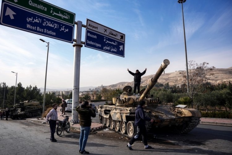 Suriye’nin başkenti Şam’ın merkezinde Esad rejimine ait tanklar üzerinde zafer pozu veren siviller, özgürlüklerini kutluyor.