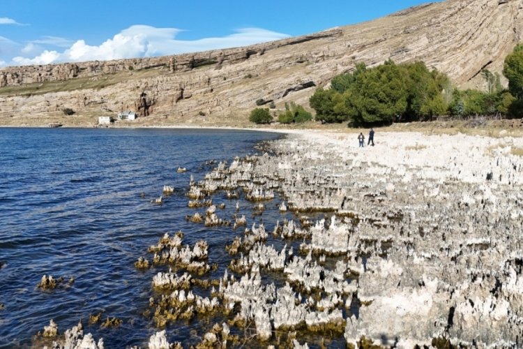 Türkiye’nin tek sodalı gölü olma özelliğini taşıyan Van Gölü’nde, son yıllarda sularının çekilmesiyle sahiller mikrobiyalit tarlasına döndü.